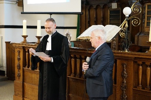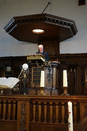 Een kwartiertje later nodigde het gebeier van de kerkklok ons om naar de kerk te gaan en daar stond iemand om ons te verwelkomen en degene die met veel plezier aan het touw van desbetreffende klok hing. De trap naar de voordeur bracht ons omhoog en daarna gingen we weer naar beneden de kerkzaal in. Je liep als het ware onder een galerij door waar het orgel op stond. Omhoog kijkend hingen boven in het middenschip 3 mooie kroonluchters. Bij het verder de kerk ingaan keek je over het middenschip naar een vrij hoge preekstoel opgebouwd op het oude doopvont met daarvoor een doophek.